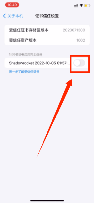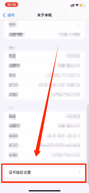 进入「设置-通用-关于本机-证书信任设置」