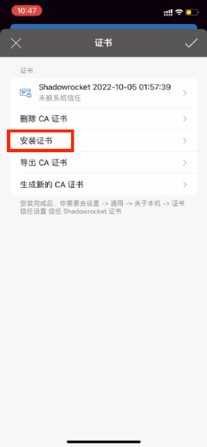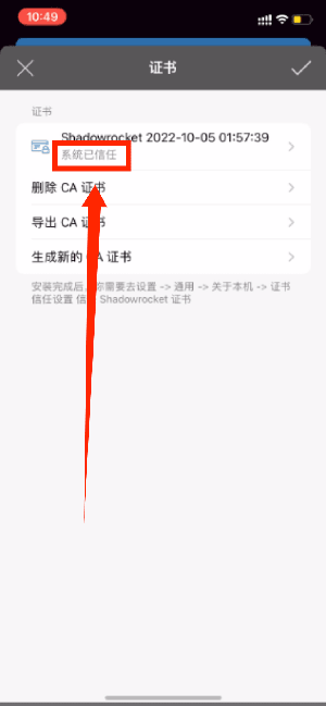 信任该证书,回到小火箭,显示「系统已新人」即安装证书成功