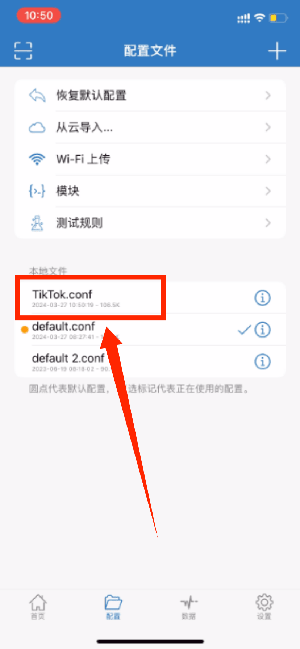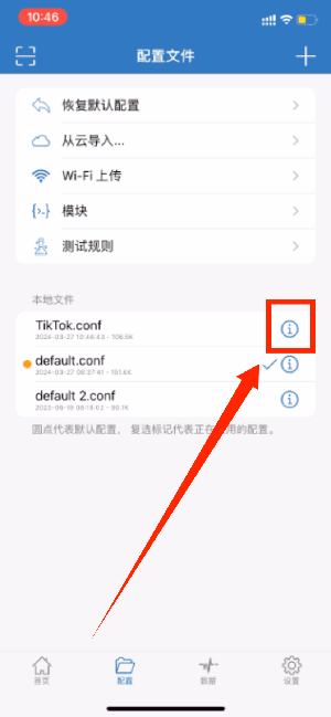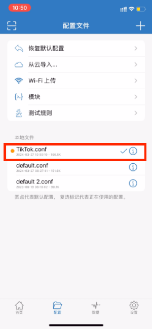 「本地文件」已经添加了Tiktok.conf,点击右侧「感叹号」