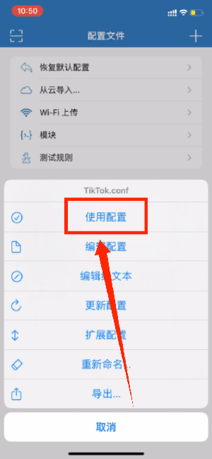 设置好国家后,返回到配置文件,点击「Tiktok.conf」,点击「使用配置」,tiktok.conf左边显示橙色小圆点,右侧有对勾就是已经切换好配置了