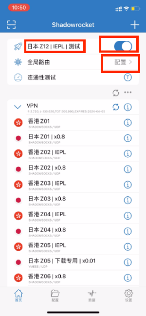 回到小火箭首页,确保已经开启代理,代理模式为「配置」,节点最好选择一个干净的节点