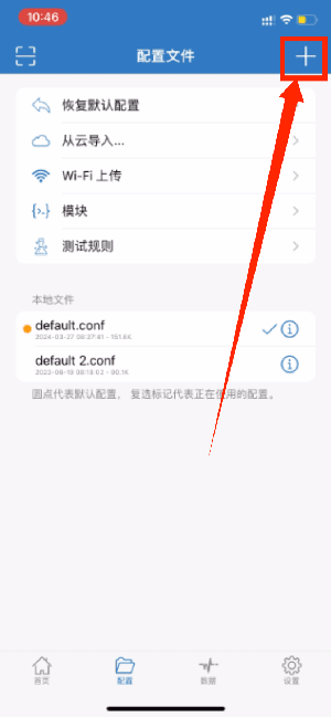 打开小火箭,点击下方「配置」,再点击右上角「加号」