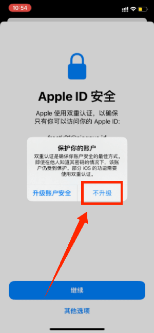 这里是触发了Apple ID的风控机制,选择「其他选项」、「不升级」即可绕开